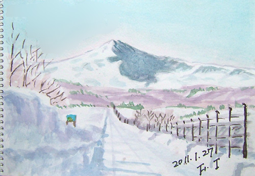 NO.863 わ〜、久々の快晴スケッチでした〜♪ (2011/1/27)今年初めてですね、嬉しい朝を迎え、ブナの木に咲く雪の花を撮ってみました〜♪ これだけ素晴らしいスカイブルー♪ 早速、スケッチドライブに誘われましたよ (^◇^)〜♪ 本日の、出来上がり〜♪ やはり、スカイブルーと言うだけで、気分も爽快ですね〜(*^▽^*)♪ 15分スケッチ・2011年1月 で、ご覧頂けます。 今日は晴天のドライブ、一緒に楽しみませんか〜(*^▽^*)♪ ドライブ4本ご覧頂けます。 帰宅途中の、新鶯橋近辺から眺めた鳥海山です♪ |