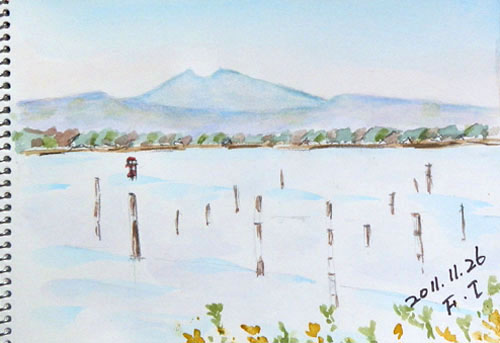 NO.913 霞ヶ浦にて、筑波山スケッチ (11/11/26)日中は暖かいので霞ヶ浦までスケッチドライブでした♪ スケッチ出来上がり〜(^-^;) 頂上の左が男体山で右が女体山。 釣りをしてるオジサンがいたり、鴨が沢山いたり、お魚沢山居るのかしら?\(☆^∇゚)o 土手の反対側の景色♪ 黄色い花は、たぶんセイタカアワダチソウです。 15分スケッチ・2011年11月 で、ご覧頂けます。 |